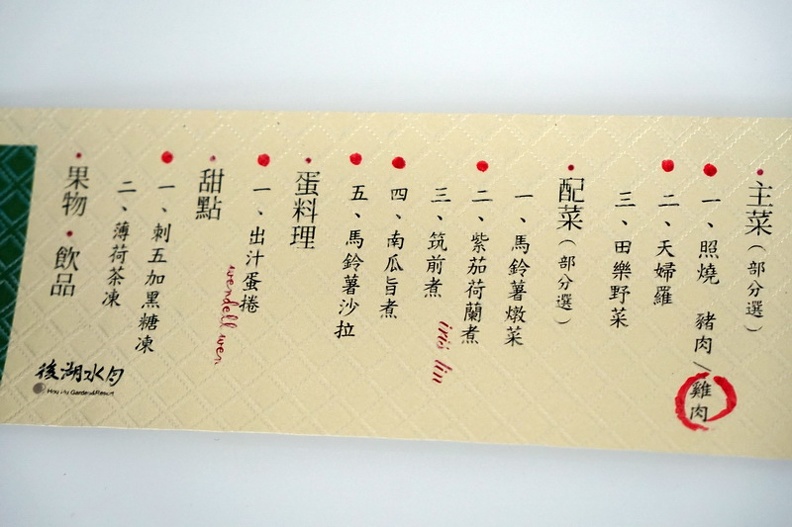 後湖水月他們的餐點上菜前都會寫上一份今晚的菜單,而且菜單做的十分的精細,質感非常的好啊