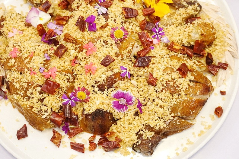 風沙骨脆皮雞 哇哇哇 金黃色的脆皮雞上灑上滿滿的蒜酥。上面五顏六色的花朵朵 這這個脆皮雞增添了很多美感ㄟ 這個我喜歡^^