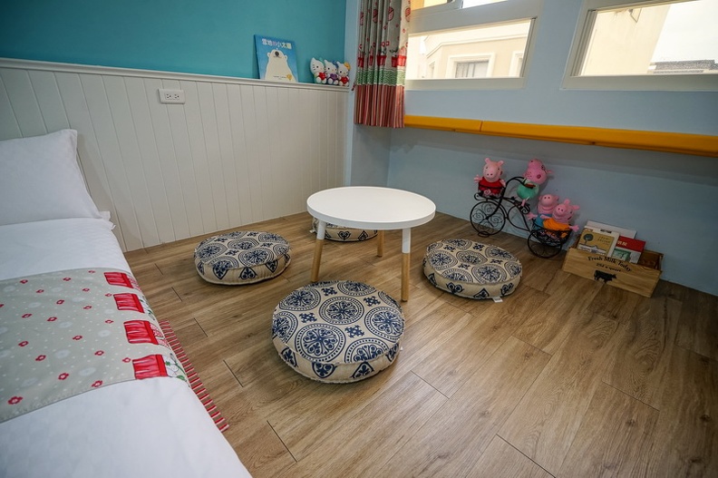 舒適四人房 木地板上放上2張雙人床,刻意的離地面不高,最主要是除了可以住四人之外,他其實更多的是提供一個給親子的空間,還一個小小遊戲區可以讓小朋友在木板上滾來滾去,或是大一點的小朋友會纏著父母要玩手機,但給小朋友玩太多手機真的不好,房間內還有準備繪本,可以讓孩子遠離3C啊~