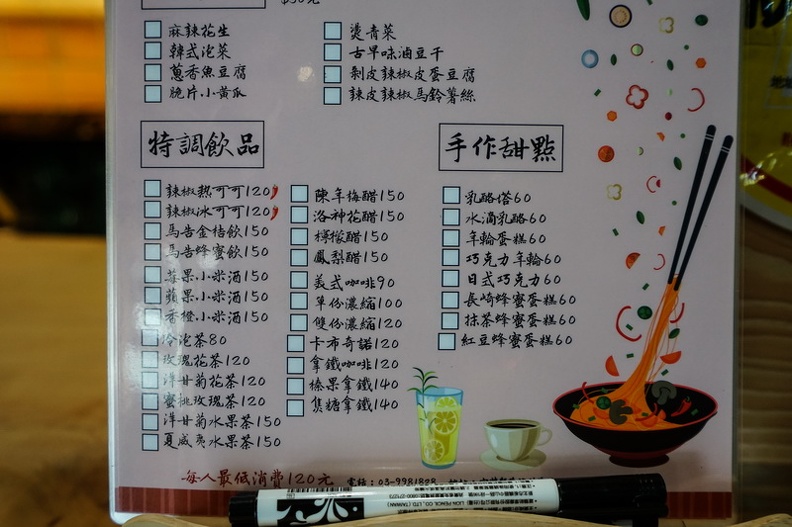 菜單,他們的菜單大都是以是他們產品所延伸出來的,而且他除了麵之外,也有是飯可以做替換,再來也有提供素食及不辣的餐點可以選擇唷 飲料區的辣椒可可還蠻有趣的ㄟ!