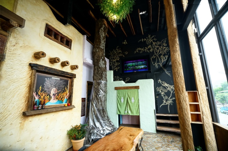 店內植物通通都是辣椒啊XD 這也非常合理。而牆上畫的也是當地植物,另這個樹可是大有來頭,這可是埋在地底6500年前的牛樟樹烏木,樹幹因碳化過程呈現烏黑色,這可是經過碳14鑑定,是鎮店之寶啊 ~