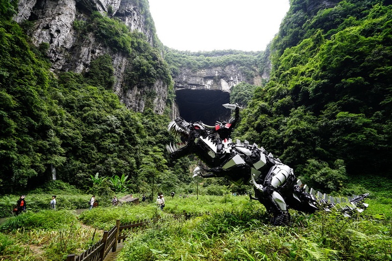 重慶武隆天坑景區的天生三橋位於重慶武隆區仙女山鎮,是重慶武隆區岩溶國家地質公園的一部分,也是因為變形金剛4在此取景的關係讓這個神秘山谷打開了知名度,而我們這次來到重慶這就是我們必去景點了,一般來說我們一到天生三橋風景區入口就會跟大黃蜂拍照,這是我們後來才拍的,因為我們來的那天剛好他們的山谷電梯正在維修,我們只好走他們的步道一路走下去啦XD