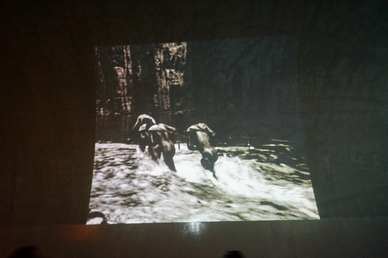 進去之後我們會經過一個長隧道,隧道之中會投影這當年這些在川渝地區這些縴夫們與洶湧而下的湍急水流拉著船逆流而上照片,