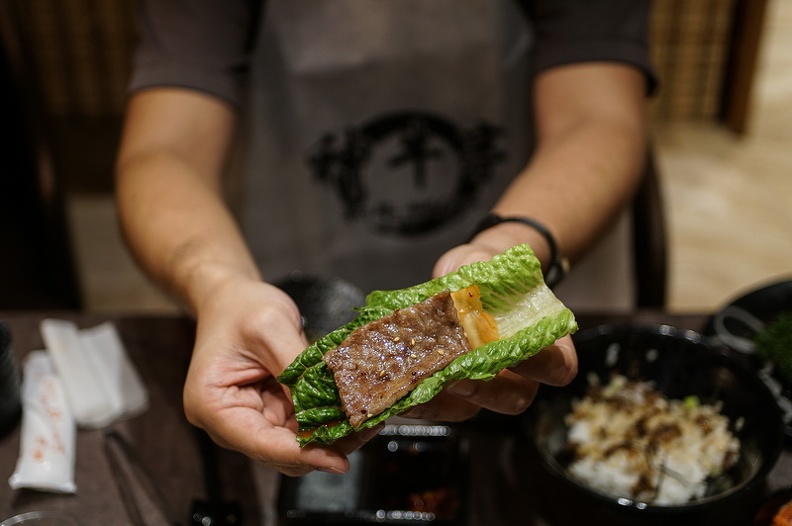 是說大家覺得吃和牛來自己烤會不會烤不好,和牛他是一個油脂非常多的牛肉,其實下去不用多久就可以吃了,再來和牛上桌之後,會有穿著和服的服務生來教大家怎麼烤喔~不用擔心