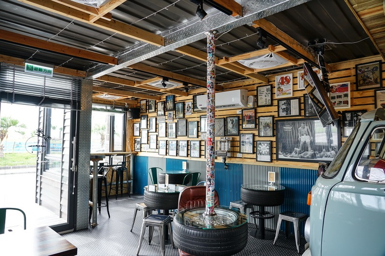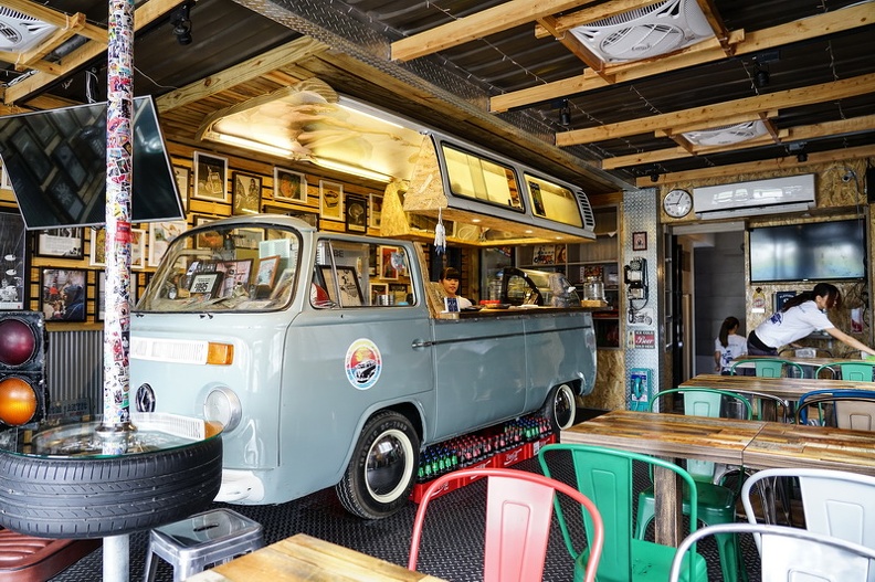 我一踏進餐廳裡,餐廳裡居然有台車!而且還是用福斯t2所改裝的吧檯啊,搭配有工業風的鐵質地版是非常的好看啊,而且可不只是如此啊