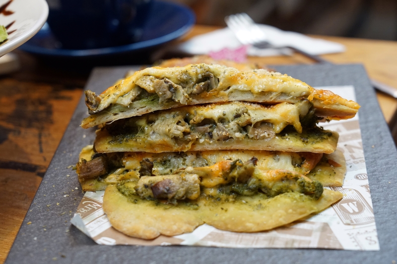 他的餅皮跟我們一般吃的連鎖如麵包般的厚餅皮是不一樣的,他是薄的,然後的口感比較是像很扎實的酥皮,還蠻特別的ㄟ,而青醬的味道很夠,然後野菇就是認真野菇是沒有肉的,感覺吃鍋邊素的可以吃