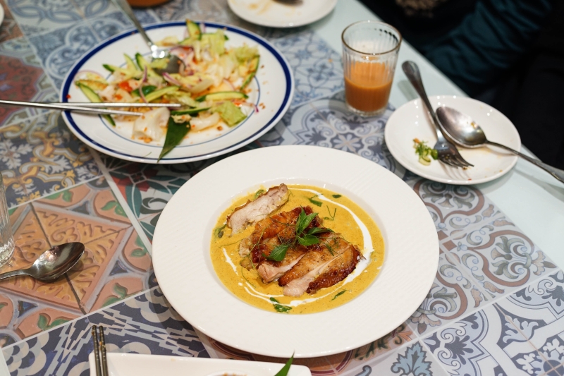 紅咖哩使用的香料除了泰式一般常用的香料之外,還加入了很明顯的胡椒及蝦醬風味, 而且辣度還蠻高的,但也因為這個辣讓風味變得很好,不過他入口的甜味稍微高一些,我個人不喜歡鹹食裡有太強的甜味,這是我個人喜好問題,撇開甜味來說,這道很強,如果有來吃的朋友可以點這道試試,辣度的部分是可以調降的唷