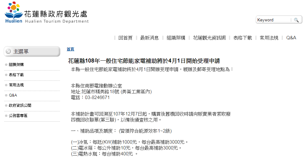剛剛看到花蓮縣政府觀光處的公告我就馬上跟大家說,只要是花蓮縣一般住宅購買節能家電(符合能源效率1~2級)補助將於4月1日開辦受理申請,冷氣、電冰箱及電熱水壺都有補助,一台最多3千元,而且購買日可回溯至107年12月7日,馬上跟大家說要怎麼申辦唷
