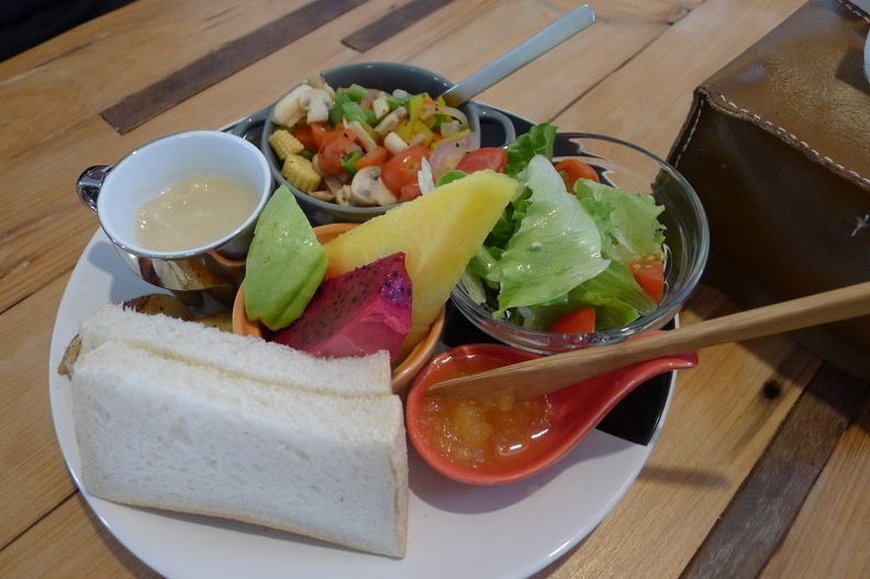 香料豬肉排(240)有沙拉 香料馬鈴薯塊 洋蔥湯 新鮮果汁 水果 炒蛋 小滿麥拾的吐司及果醬 我真的不得不說 每一樣都好吃啊 馬鈴薯塊烤得剛剛好 味道恰到好處 果汁一喝就知道是新鮮的 小滿麥拾的麵包口感好 自製的鳳梨果醬非常好吃