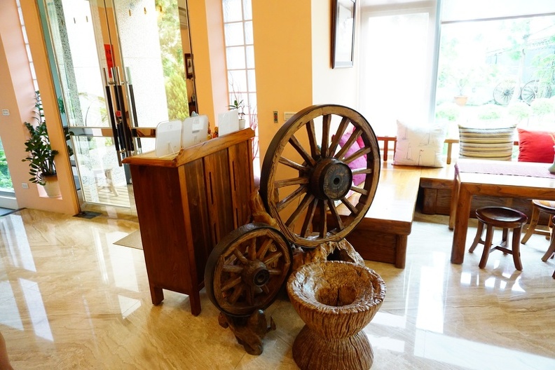 這個用木頭車輪所做成的木桌及木椅 民宿主人說這可是真的從牛車拆下做成的 有好幾十年的歷史了