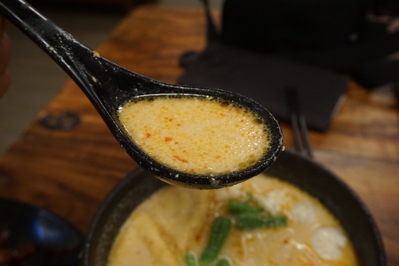 恩嗯~他的湯頭對我來說略鹹了一些 不過一入口 就可以感受到南薑 香矛和椰漿的味道 味道其實還蠻不錯的ㄟ 不過如果香料味能夠再強一些我會更喜歡