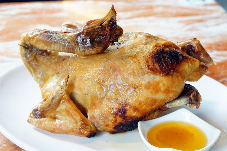 他們已經將多餘的油脂烤出來,所以他的雞皮的口感非常酥脆,又帶著火烤的的獨特香氣 ,我們再把雞肉沾雞本身留下的雞油一起吃入口,整個雞肉的好滋味都會在嘴中散發出來啊!