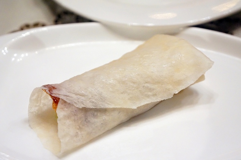 傳統的烤鴨裡面就是甜麵醬與小黃瓜及蔥段。頤宮他們的片鴨是肉與皮是分開的,我們吃的的部分都是皮的部份,他們的皮酥脆的口感及經過再一次炙燒後的油氣香,一口咬下,皮是會脆化開的,真的不錯啊…但是我對他們傳統的烤鴨卻有點失望…為什麼這樣說呢?不是好吃嗎?? 我覺得原因是出在他的餅皮,之前我說過了,他的烤鴨皮肉分離,他能展現的風味都是在那鴨皮上,而我今天整捲入口的時候,餅皮太大張,導致餅皮的味道多了影響到烤鴨的表現