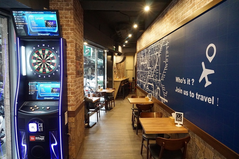 走進一樓,就可以看到有射飛鏢機,其實我還蠻愛射飛鑣的ㄟ,我覺得還蠻有趣的,跟朋友丟個幾鏢,不管有沒有中靶都覺得開心^^。而一上二樓位置真的超多的啊!深淺對比的木質傢俱,再加上牆壁上的紅磚,頗有美式鄉村風的感覺,讓而且店內放著流行音樂,聽起來就讓人覺得心情雀躍的感覺^^