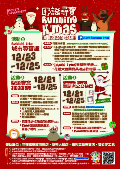 聖誕節要到了,覺得觀光風景區人很多,實在不想去,但是待在家又很無聊,不知道該怎麼辦,沒關係!不想出去玩,那就在花蓮市尋寶吧!!從12月21日-12月25日,在花蓮市區有耶誕尋寶Running city 城市尋寶趣的活動,最大獎項有iphone 7 plus(1支)及太魯閣晶英酒店住宿卷(1張)!還不只如此喔! 還有遠雄悅來飯店住宿卷(1張)、花蓮翰品酒店吃到飽餐卷(10張)及1500份的聖誕糖果包(送完為止)和驚喜小禮物(送完為止)唷,!這樣好康不參加怎麼行呢!