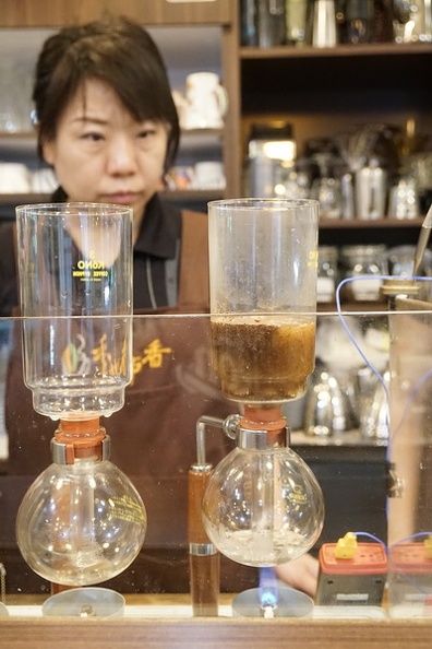 這邊只要不主動說要手沖 都是用賽風壺來煮 他們是水上去滾一分鐘的方式 但很特別的是 他們會先用濾網篩粉後 最大顆粒的先下去煮 之後再陸續加入他篩下比較小顆粒的下去煮 這樣的方式好特別唷