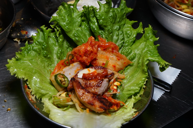 用了豬五花、黃豆芽、泡菜、韓式烤肉醬、辣椒、生洋蔥,加上了韓式辣椒醬,最後再用生菜包起來,真的不得不說他們的醬料真的對味啊!而且豬肉品質真的超級讚的,這樣配可真是好吃啊^^ 我喜歡!!