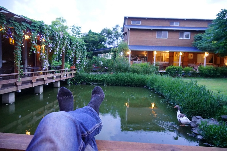 毫不猶豫 東西立馬丟一丟就先在陽台上享受啦,腳跨在木頭欄杆上,池塘跑了了民宿養的鵝,聽著陣陣蛙鳴,有夠放鬆的