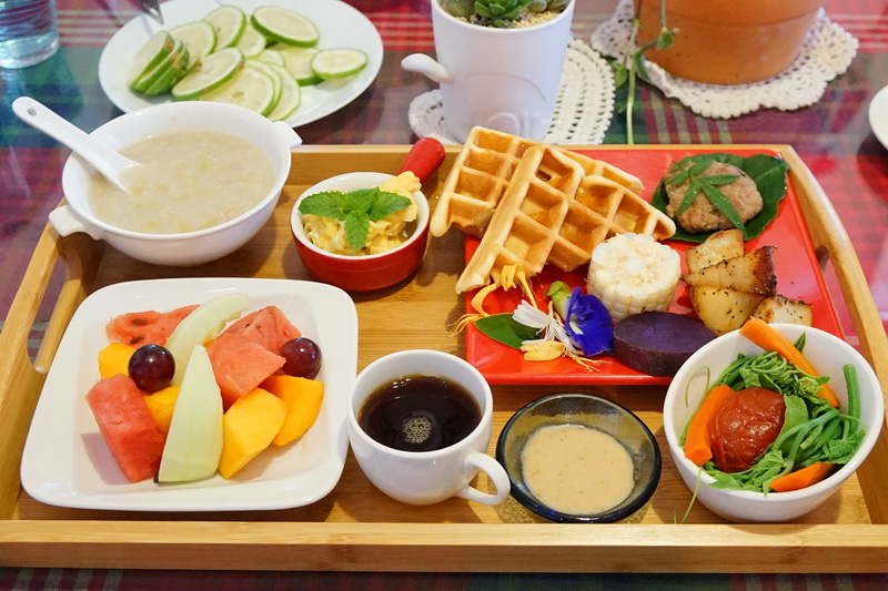 這個餐好豐富喔,有西式鬆餅,中式的粥,好多種的蔬菜和水果盤,還有洛哥的咖啡,看起來超級豐富的啦