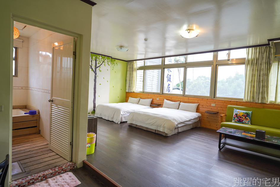 椰子林溫泉民宿房間有小木屋,我今天不是入住小木屋,而是套房型的房間。走進來有嚇到,真的不曉得它們有這種很像是情侶住的房間,質感蠻好的,木質地板腳踩很舒服