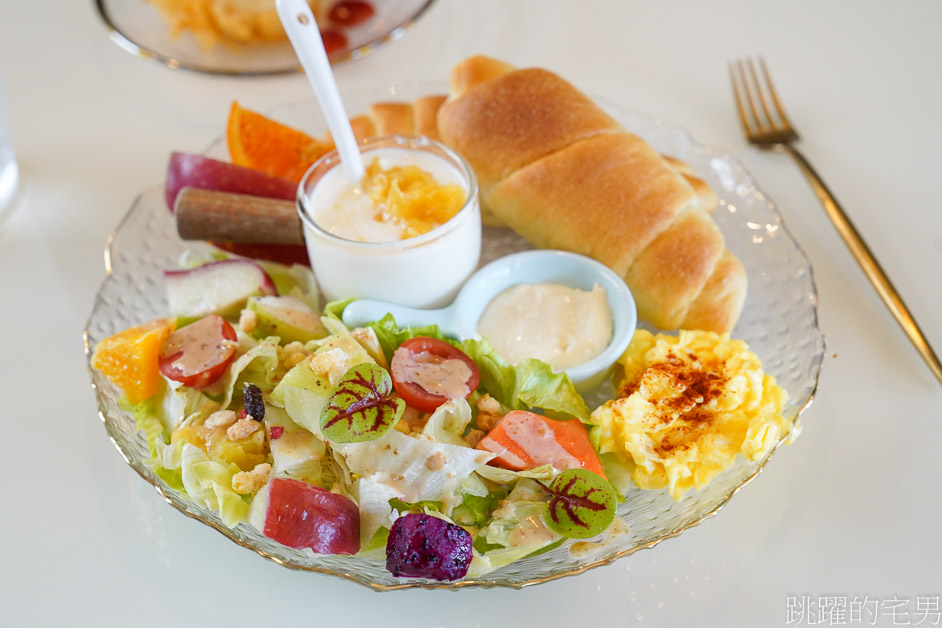 我們有一個朋友是吃素的,他是選了奶油捲麵包盤,沙拉、優格、滑蛋都有,必須說他的奶油麵包捲略有嚼勁的口感,淡淡的鹹味,帶出麵粉的香氣,老實說跟貝果比,奶油捲麵包味道我更是喜歡,再來還有附上一個沾醬可以搭配使用ㄟ^^