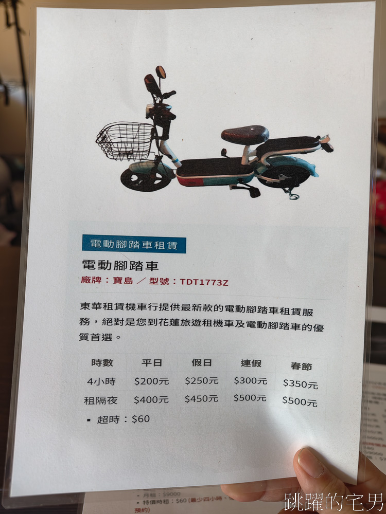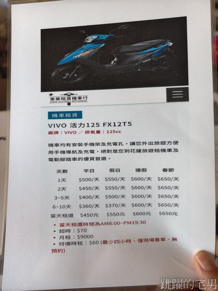 東華租賃機車行費用500元/550元一天,他有2種機車價格,另外你想租電動腳踏車,這裡也有,也提供半天租車(4小時) 價錢給大家參考,對了,租車別忘了帶駕照喔!
