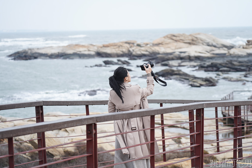 車停好我們就走上觀海平台,這邊就有一個很長的棧道架設在岩石之上,一路延伸到海邊,這感覺真棒ㄟ,雖然說沒藍天,但是景色真的很美呢~