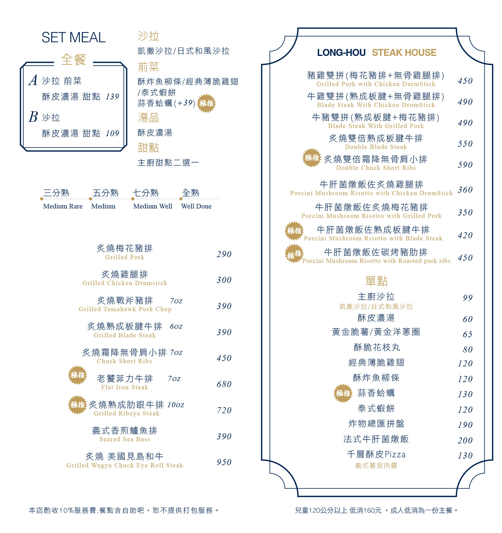 瀧厚炙燒熟成牛排菜單,提供給大家參考,這裡的的餐點除了牛排之外,不吃牛肉的人也可以選豬排跟魚排,選擇是很多樣的,這裡價錢都是包含他們的自助吧,等會跟大家介紹,套餐則是+139元或109元,提供另外的附餐喔