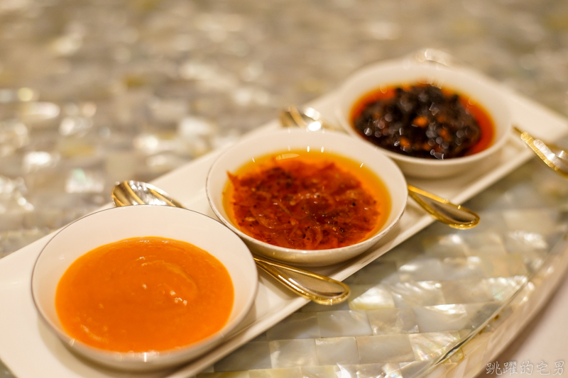 桌上已經擺好了辣椒醬、海鮮XO醬、豆豉辣醬 這個XO醬超厲害的 搭配今天的餐點 配上都好好吃!