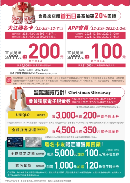 12/3-12/7活動期間大江聯名卡單筆消費滿999元可獲得電子現金券200元、APP卡友會員12/3-2022/1/2活動期間單筆消費滿999元可獲得電子現金券200元。館內餐飲1000元加送電子現金券120元,全館指定店櫃滿4500元送電子現金券350元!