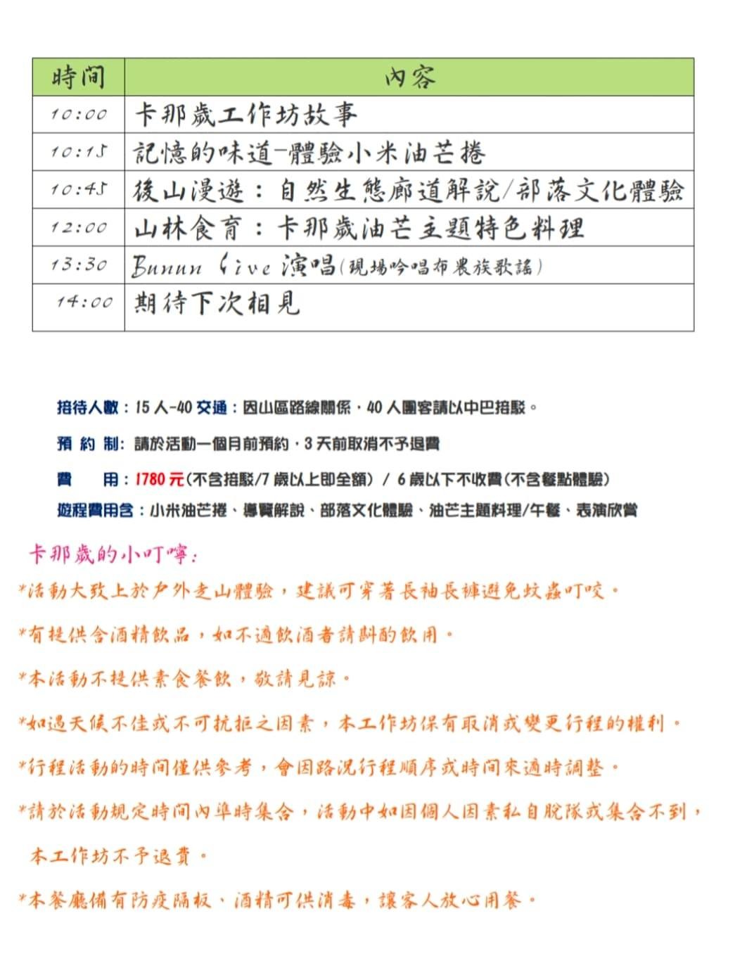 卡那歲文化工作坊行程4小時,人數15人起,費用1780元/人,可以選擇單用餐的部分,人數就不用15人,這部分就要跟他們詢問