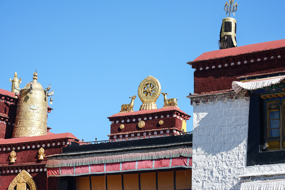 金頂前面的金色法輪和兩匹臥鹿是它的重要標誌, 我們去的第一間西藏佛寺是大昭寺,也是西藏第一個佛寺,而且居然跟當時中國的文成公主有關係